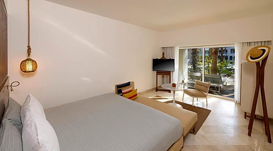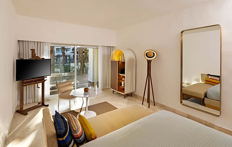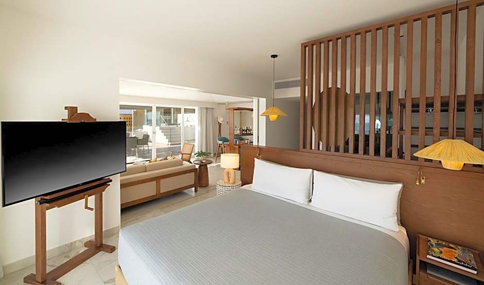 Located on the ground floor this suite features bright colors and unique pieces of modern art. The private balcony offers magnificent views of the Sea of Cortez. The suite also offers a 26-inch flat-screen satellite TV, mini fridge and safety box. The bathroom includes bathtub, rain shower, bathrobes and luxury toiletries. The large glass-sliding door allows natural light to filter. Welcome amenities and a coffee maker are included, as well direct access to the VIP lounge, special breakfast and concierge service.