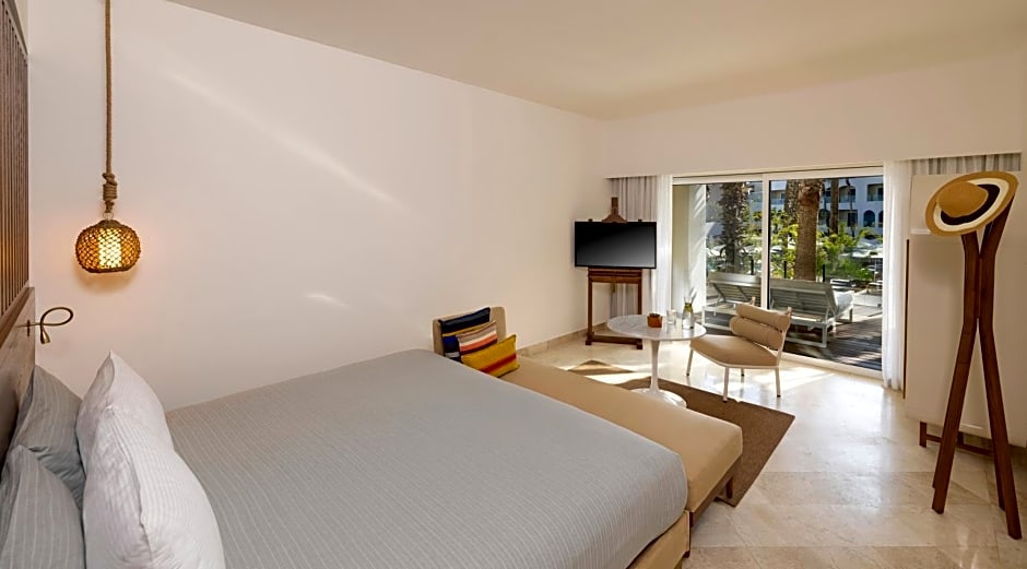 This room features contemporary décor and magnificent views of the resort’s garden and pool from its private balcony. It also offers a 26-inch flat-screen satellite TV, DVD player, mini fridge, and safety box. The bathroom includes rain shower, bathrobes and luxury toiletries. 1 king-size bed is included or 2 double beds under request are available.