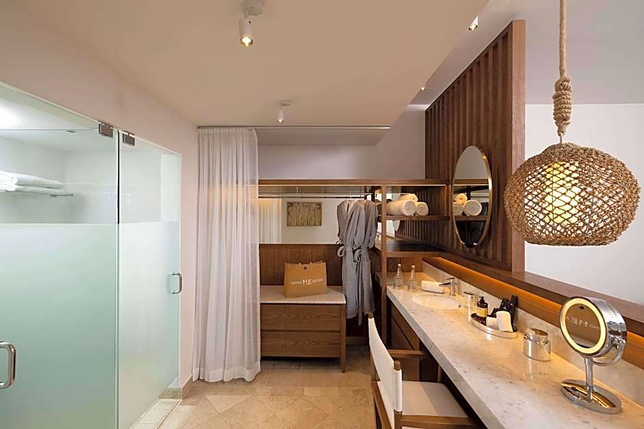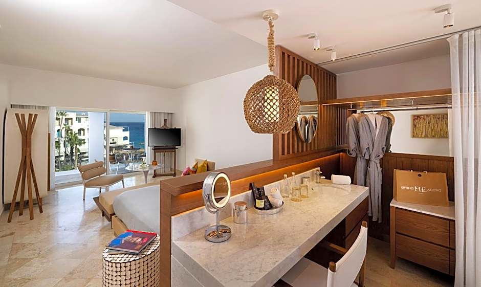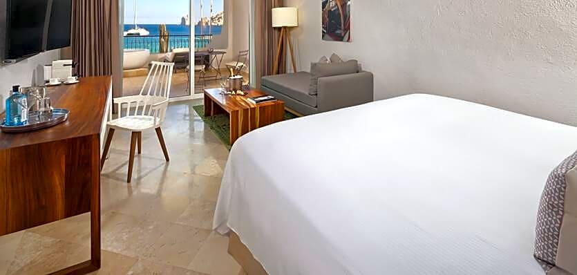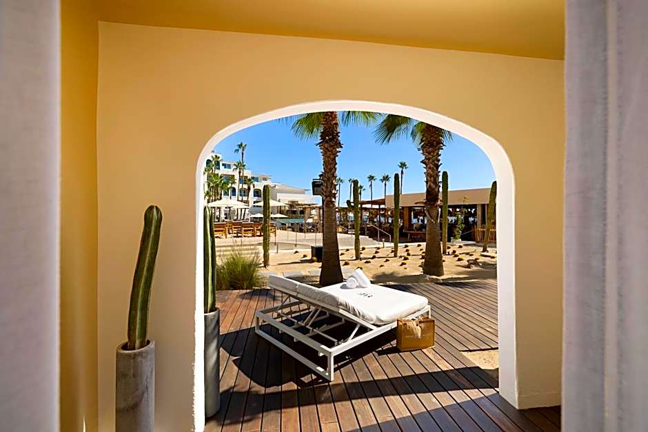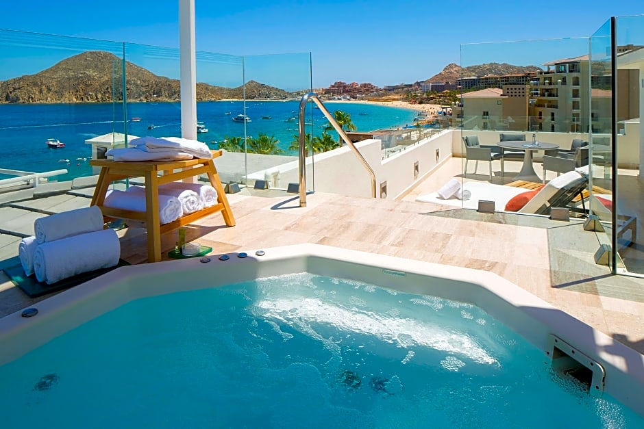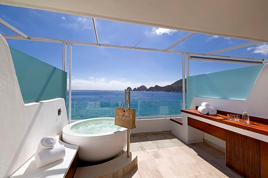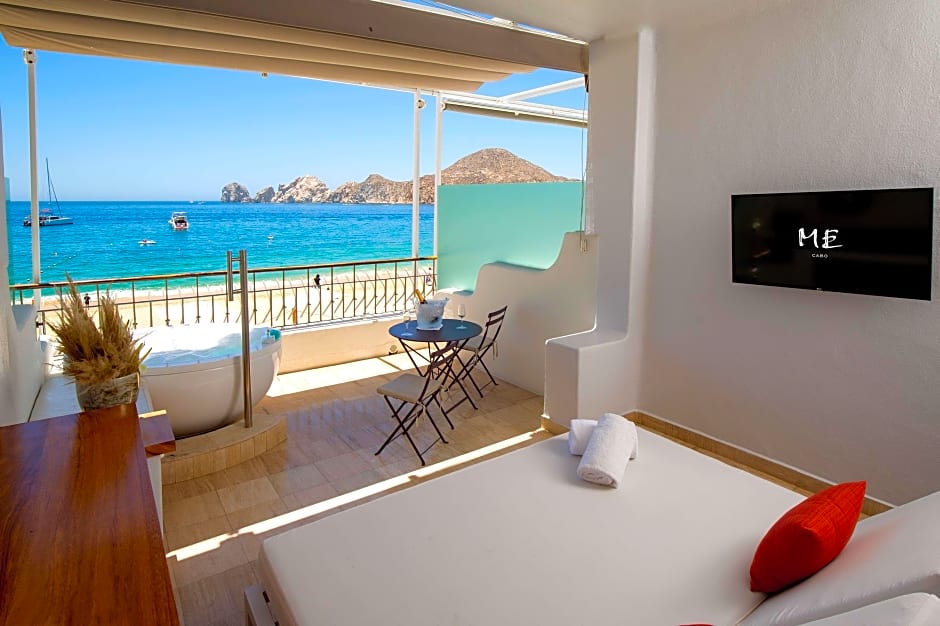 This room category is for adults only Imagine your own private sun deck overlooking the iconic Arc, the sparkling Sea of Cortez, and popular Lovers Beach. With views of the ocean, lounge beds, a private whirlpool tub and an outdoor rain shower, the Loft Suites offer a luxurious home away from home. A separate dining area and sitting area provide ideal spots to gather with friends and enjoy breathtaking views of Cabo. The Loft Suite features all the VIP amenities that define ME+. Large, sliding-glass doors allow the Baja sun to flood the room with crisp, white light. Spacious guestrooms are part of ME+ and offer private, furnished terraces overlooking the Sea of Cortez. VIP amenities enhance your experience. All suites come with King sized beds & terrace and include the private sun deck overlooking The Beach Club and the Sea of Cortez.